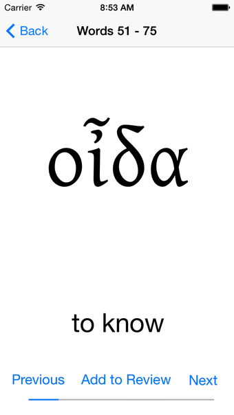 De applicatie 'Biblical Greek Vocabulary' is een educatieve tool die ontworpen is voor studenten die de meest voorkomende 2000 woorden in het Grieks Nieuwe Testament willen bestuderen. De woorden zijn gestructureerd in sets van 25, die kunnen worden gemengd om op maat gemaakte lijsten te creëren. Studenten kunnen de woorden individueel bekijken, de Engelse vertaling onthullen en verder gaan naar het volgende woord. Bij foutieve identificatie kan een woord naar een herzieningslijst worden gestuurd voor extra oefening.